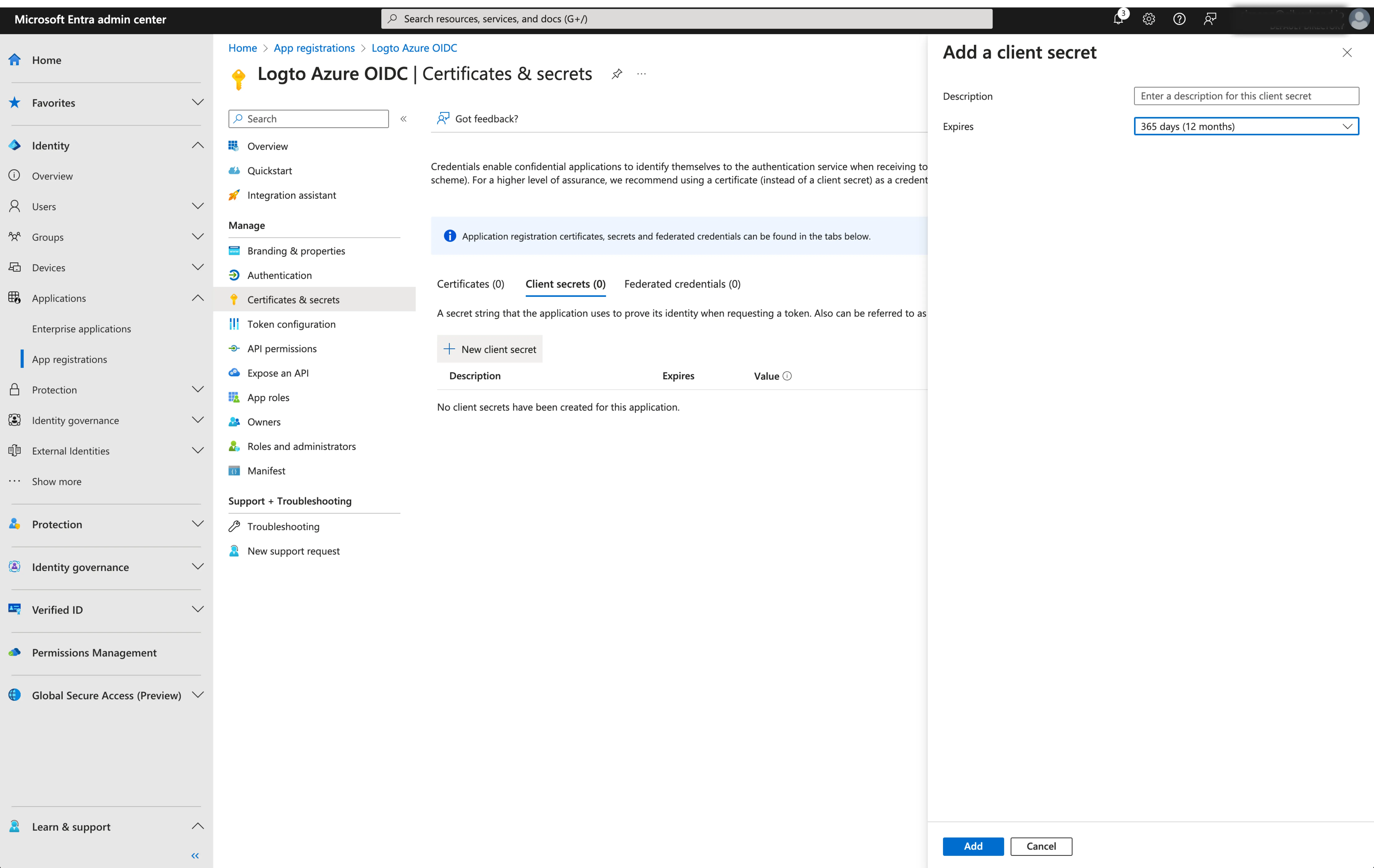 - Client Secret: Create a new client secret and copy the value to Logto. This secret is used to authenticate the OIDC application and secure the communication between Logto and the IdP.