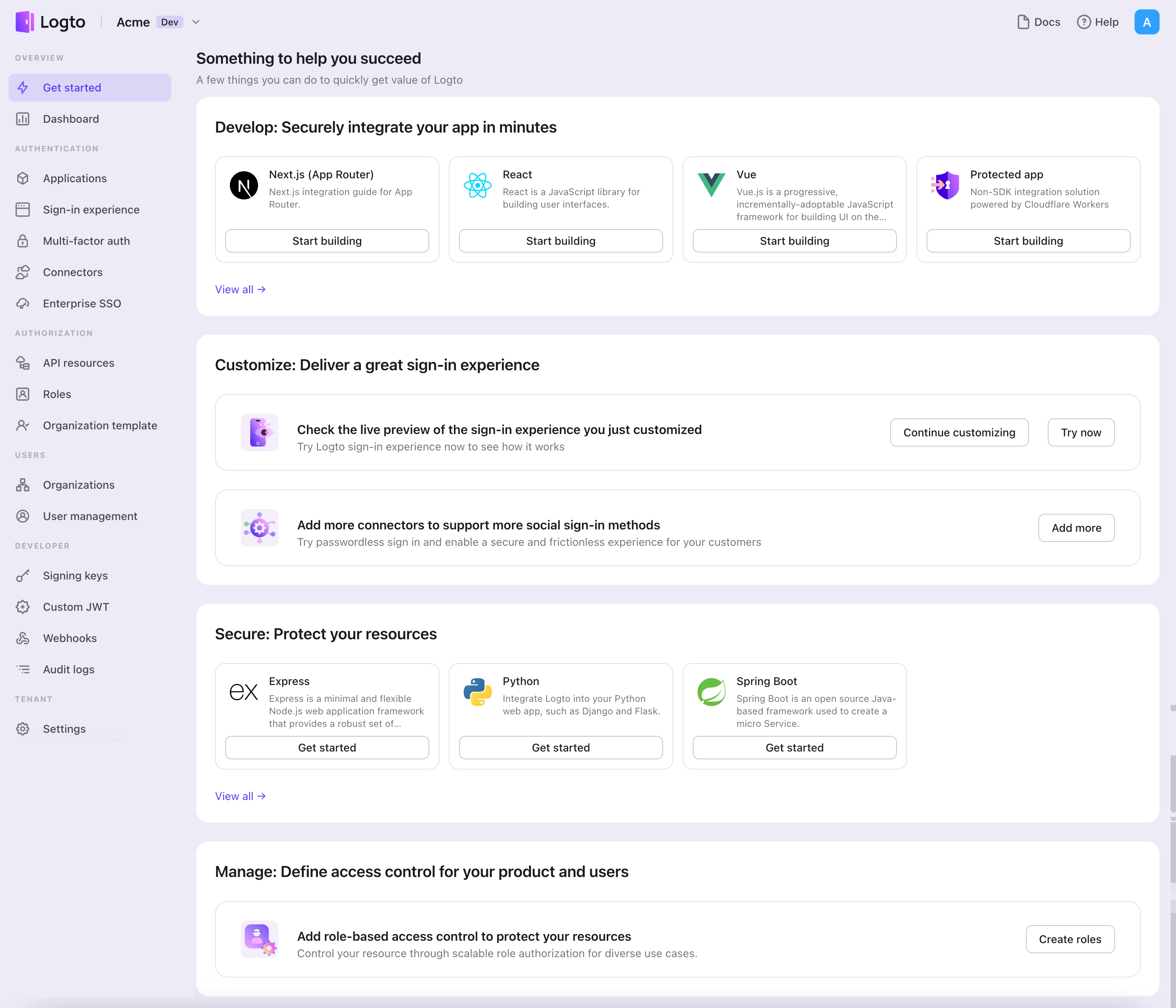 End-user flows: Logto provides a out-of-the-box authentication flows including MFA and enterprise SSO, along with powerful APIs for flexible implementation of account settings, security verification, and multi-tenant experience.